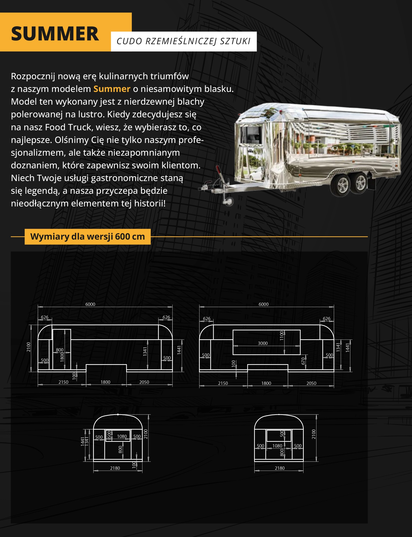 Odkryj Summer Series S – najnowszy wymiar luksusu w świecie Food Trucków! Przedstawiamy model Summer, który przeszedł fascynującą transformację, a teraz prezentuje się w spektakularnym blasku nierdzewnej blachy w trzech zachwycających kolorach.