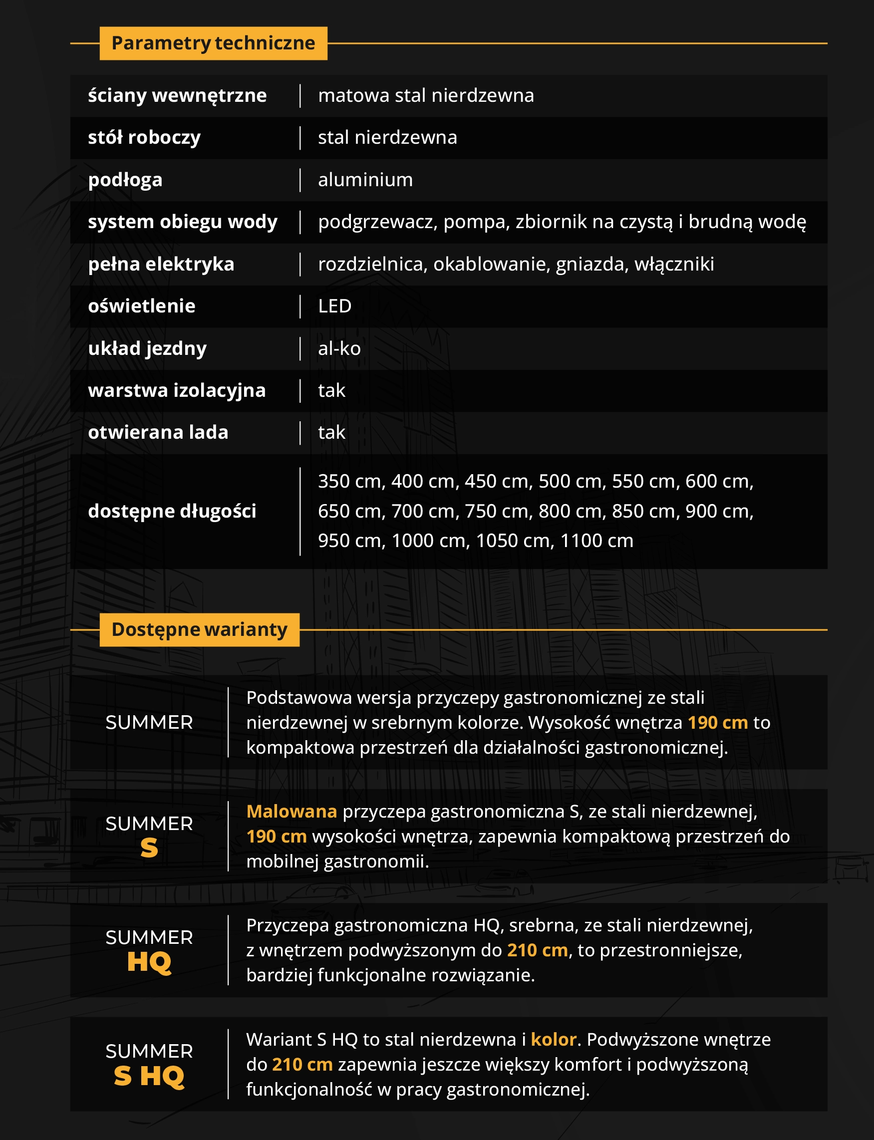 Zwiększona widoczność: Przyczepa gastrpnomiczna Summer jest niezwykle atrakcyjna wizualnie i przyciąga uwagę przechodniów. Wykorzystaj ten fakt do promocji swojej marki i produktów