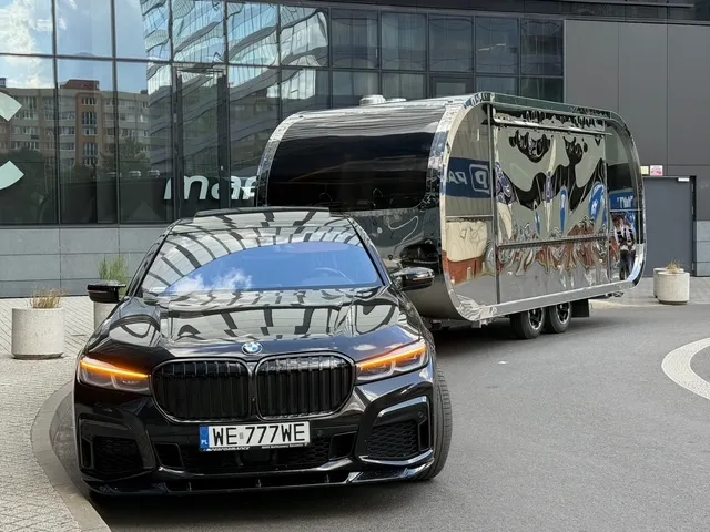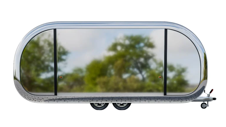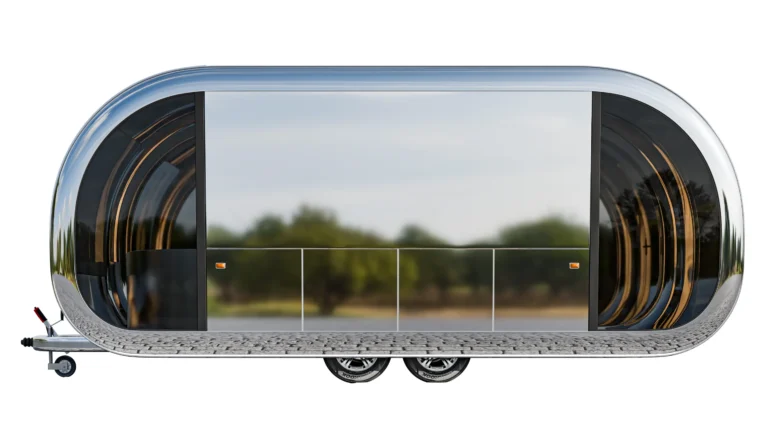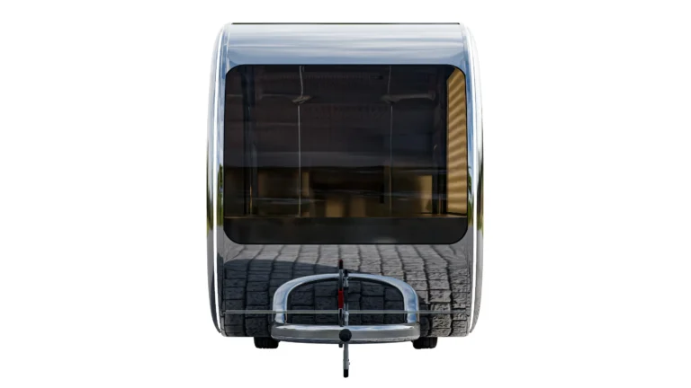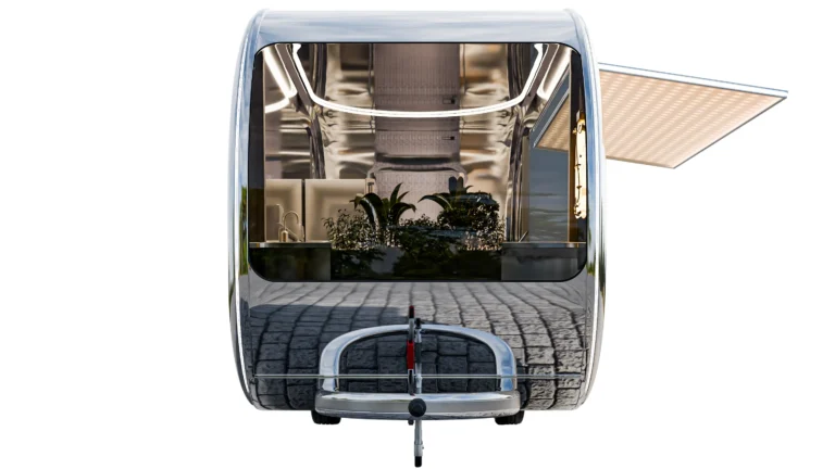 Model QUANTUM to efektowne połączenie panoramicznych przeszkleń, opływowej bryły i lustrzanego wykończenia. Dzięki temu przyczepa nie tylko spełnia funkcję użytkową, ale również staje się wizytówką Twojej marki.